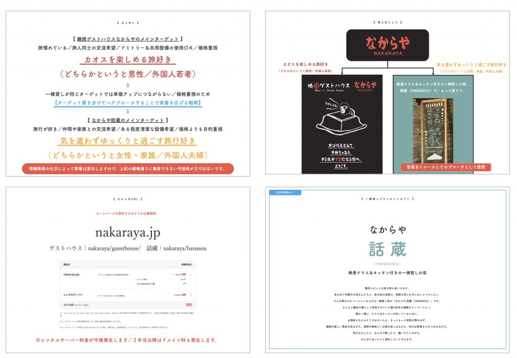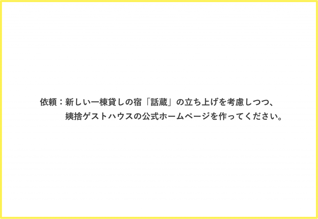 今回のご依頼は、ホームページ立ち上げありきではなく、一棟貸しの宿「話蔵」という名前が決まる前、蔵をどのように活用していくか、その方向性を考える戦略面からお手伝いさせていただきました。